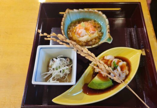 繊細な旨味の尾長鯛と、とろけるような濃厚さのあん肝を贅沢に盛り合わせた一品。 特製のポン酢ジュレが、それぞれの素材の持ち味をさらに引き立て、口の中で絶妙なハーモニーを奏でます。 見た目にも美しい、まさに五感で楽しむ日本...